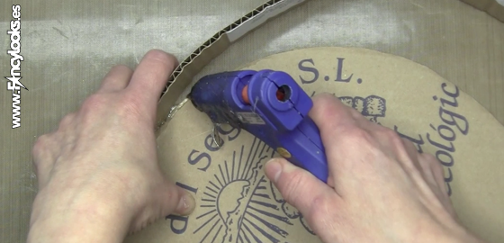 Pegamos esta tira de cartón alrededor del borde de la circunferencia con más silicona caliente, ajustando el tamaño del perímetro y cortando lo que sobre.