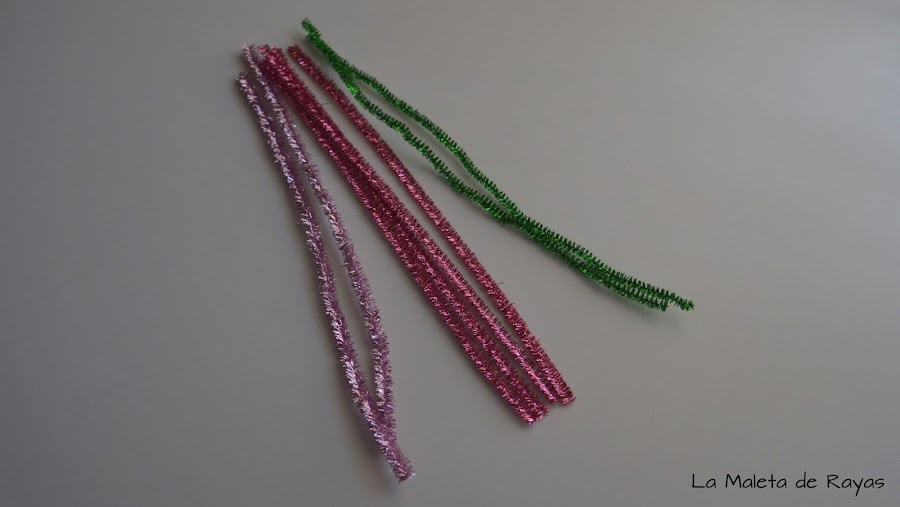 Yo he elegido dos tonos de rosa para que en el centro se quede más claro, para que haga como una especie de "degradado", pero pueden ser todos del mismo color. Cogemos los limpiapipas verdes y los doblamos a la mitad y de igual manera vamos a hacer con los rosas.