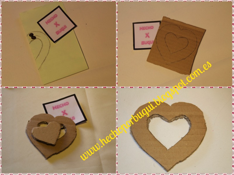 Recorta un corazón en el cartón como ves en el video, la parte central puede servirte para hacer un imán para la nevera.