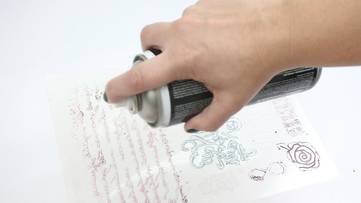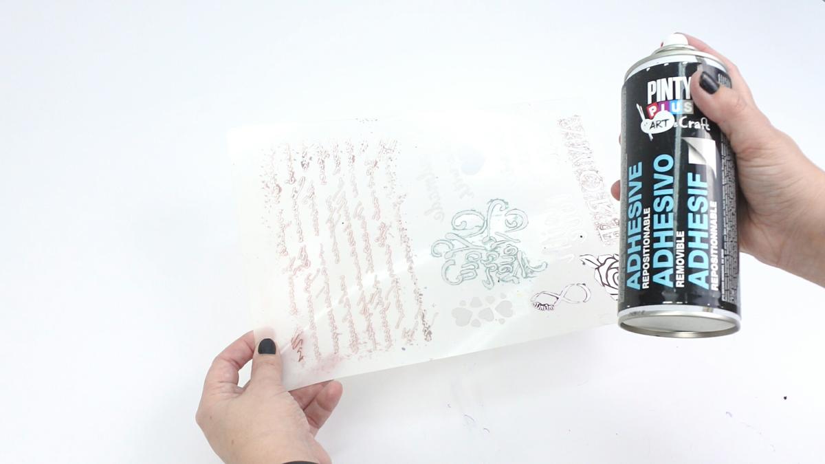 A continuación, preparamos el stencil para usarlo. Para ello le aplicamos un poco de adhesivo removible en spray de Novasol Spray por el reverso.