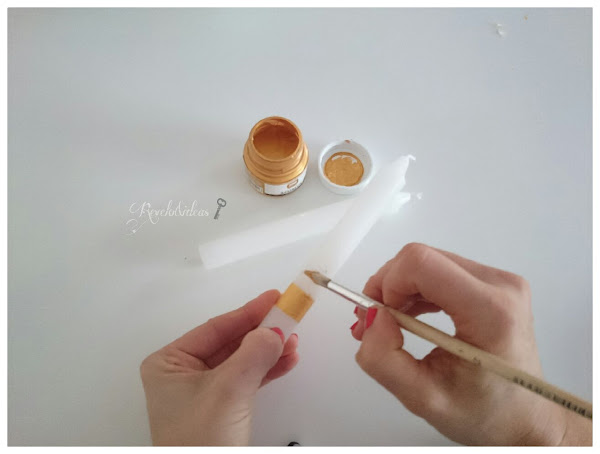Del mismo modo decorar las velas, con la pintura metalizada dorada, al gusto yo hice franjas de diferentes anchos, esta pintura seca muy rápido al tacto, y cubre muy bien.