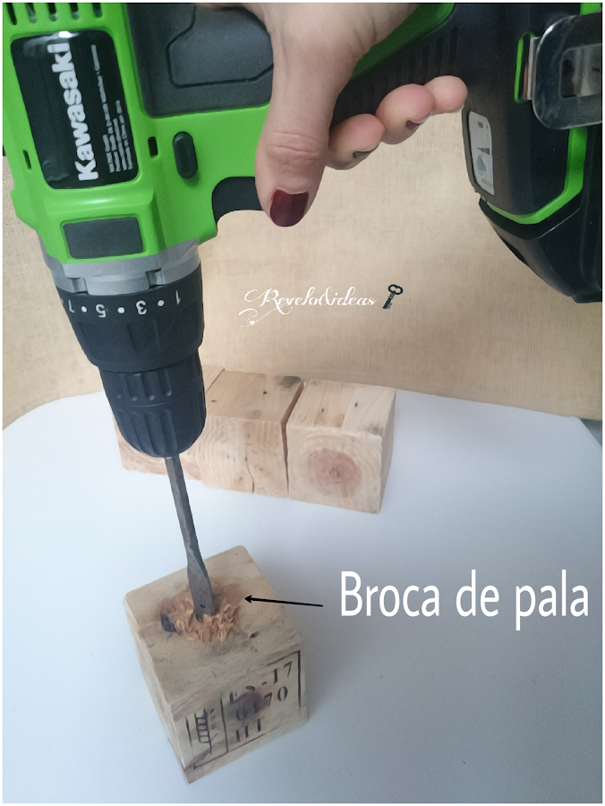 Lo primero es lijar bien el taco de madera, antes de empezar, con la lijadora, después con el taladro y la broca de pala, haremos el orificio en el sirva para insertar la vela, debiendo ser del mismo tamaño.