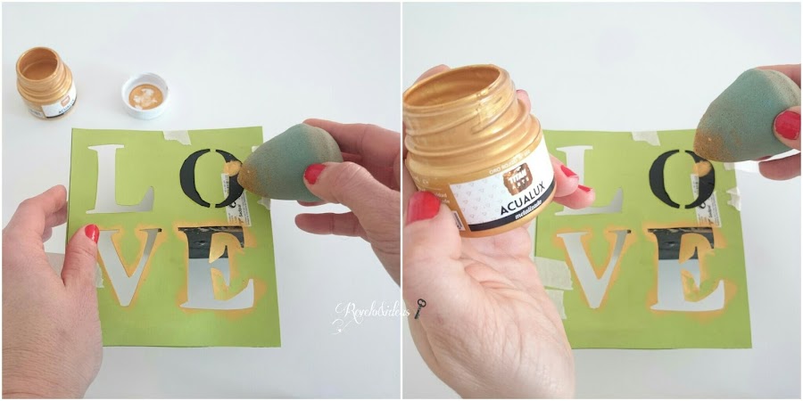 La segunda opción: hacer todos los pasos anteriores, pero saltar el de pintar con tiza esta vez vamos hacer las letras love, pero con la técnica del estarcido, utilizando una plantilla que haremos nosotros mismos, aqui puedes verlo, con pintura dorada y una esponja ( yo utilicé esta vez, una que ya no utilizaba, para aplicar maquillaje), hacer siempre esta secuencia cargar la esponja de pintura dorada, retirar el exceso en un papel y aplicar dando pequeños toquecitos.