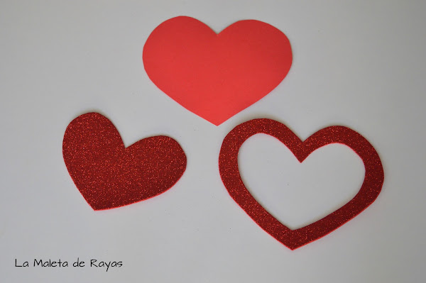 Esa plantilla la marcamos en una cartulina roja y recortamos a un 1,5CM aprox. de la marca. Esa pieza la marcamos en goma eva de purpurina y la recortamos. También tenemos que abrir un hueco a este último corazón de goma eva. Vamos a tener estas piezas: