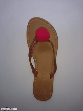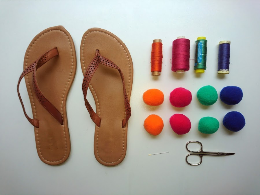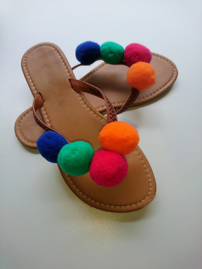 Os recomiendo que no uséis más de cuatro pompones por sandalia, que tengan la misma combinación de colores en cada sandalia y con respecto a la colocación de los pompones, que se ponga en la unión de las dos tiras un pompón para tapar esa unión, en la tira de la parte interior del pie un único pompón y dos en la tira exterior, para más comodidad a la hora de caminar.