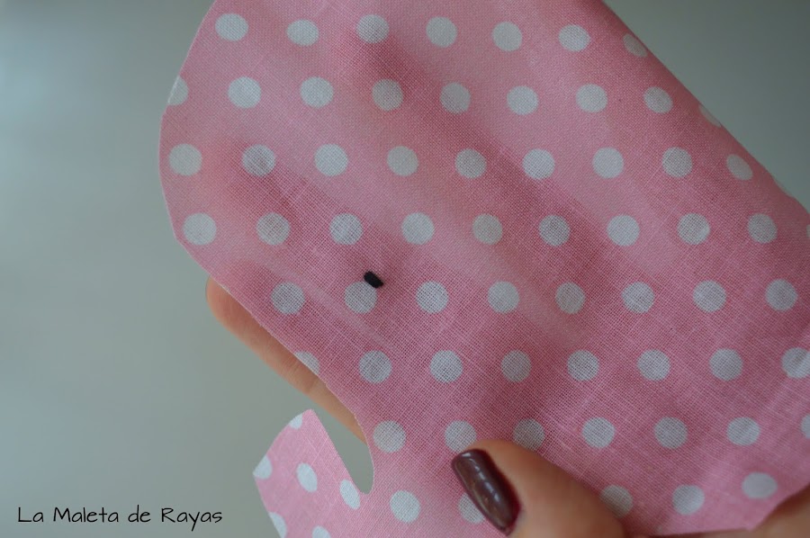 Marcamos el ojo del elefante en las dos piezas que forman el cuerpo y con hilo negro lo cosemos, dando tres o cuatro puntadas.