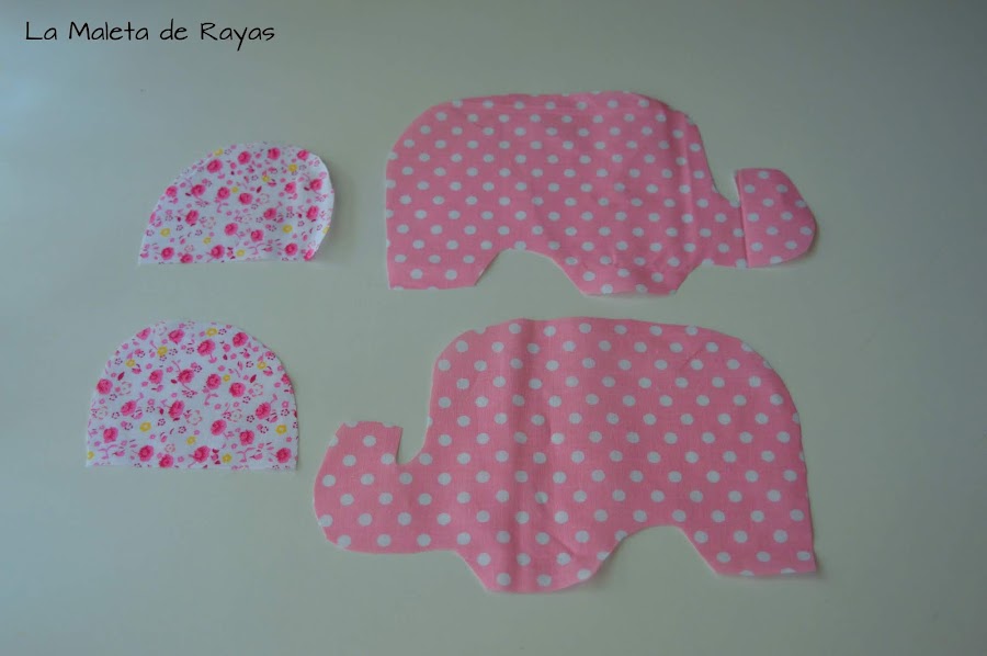 Una vez tengamos la plantilla recortada, la ponemos sobre la tela doblada a la mitad. De este modo, recortaremos dos piezas a la vez. Después, de la plantilla, recortamos la oreja y la ponemos sobre otra tela (con estampado diferente o lisa) de forma doble, para conseguir dos piezas.