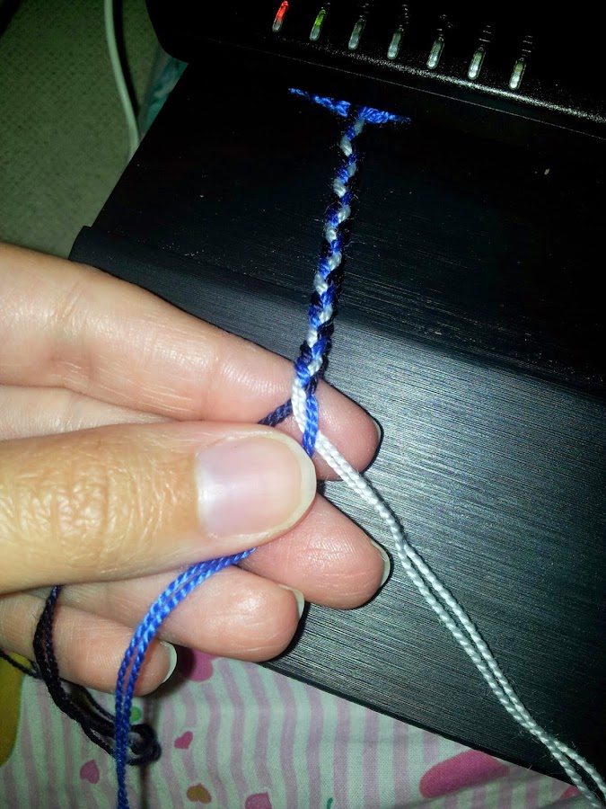 Para finalizar, remetemos los hilos sobrantes. Cortamos hilo con la longitud que se quiera, teniendo en cuenta de que van dobles. Los metemos por uno de los puntos de los marcadores y con ellos hacemos una trenza. Para rematarla le realizamos un nudo.