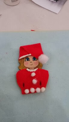 De una imagen de madera la pinté a mi gusto con pinturas especiales para ello, desde una imagen copie el traje que llevaba mi muñeca, con un papel calco con fieltro le añadí el gorro y el vestido, y los pompones, y una trasera para poder pegar el cordel y colgarlo en el árbol, la verdad quede muy contenta con el resultado, y vosotros que pensáis, ¿os gusta?. Aquí lo estuve realizando, en un ambiente super bueno, y ¡me regalaron los pinceles!:
