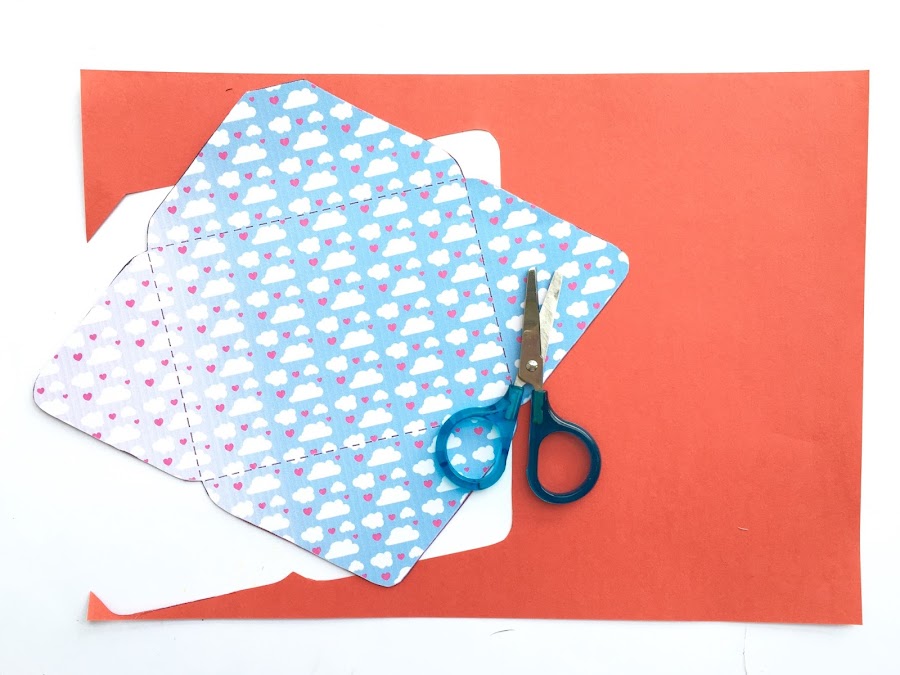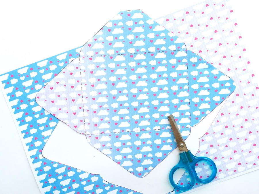 Los pasos creo que son de los más simples que os enseñado en el blog. Primero, recorta la plantilla de sobre con el estampado (yo me quedé sin tinta azul a mitad de impresión, pero luego no se va a notar, así que no pasa nada)