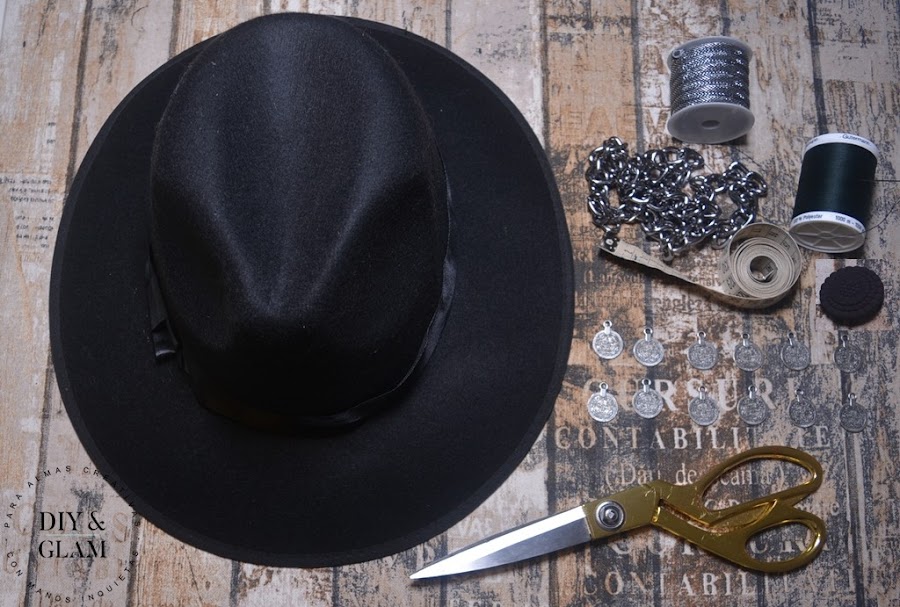 Medir el contorno del sombrero (en mi caso 59cm) y cortar el cordón plateado y la cadena con esas medida.