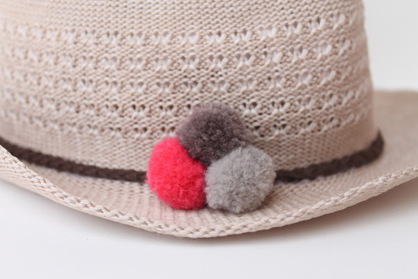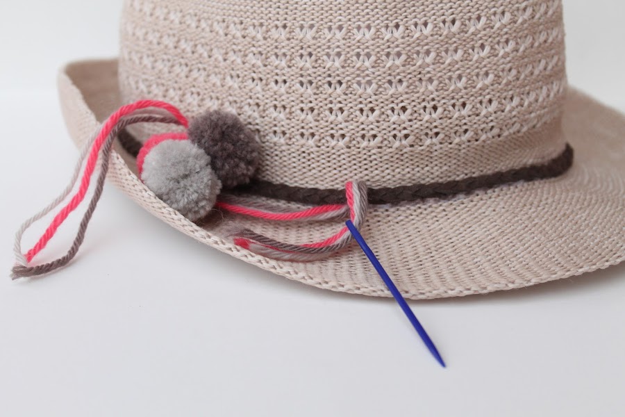 Luego he atado los pompones entre sí con un par de nudos fuertes para que se sujeten bien y los he cosido a la cinta del sombrero.