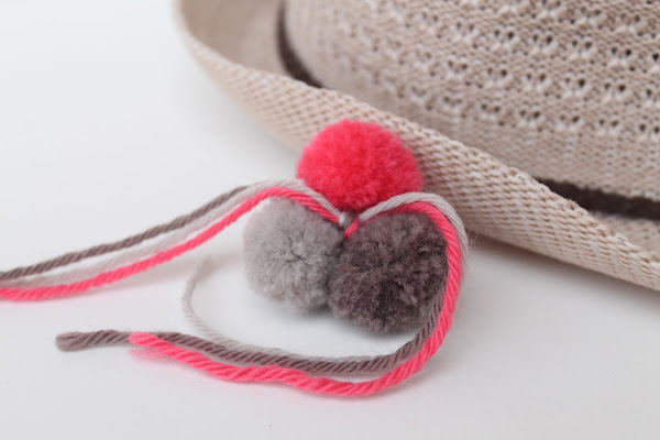 Primero he hecho tres pompones pequeñitos escogiendo colores que fueran bien con la tonalidad del sombrero, sin olvidarme de añadir un toque de rosa flúor.
