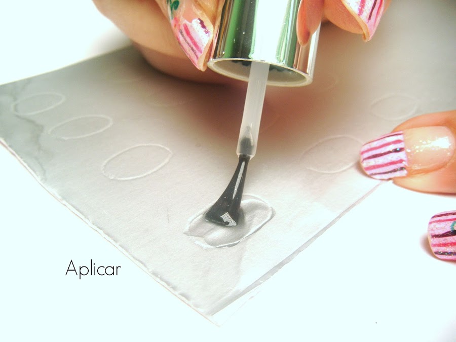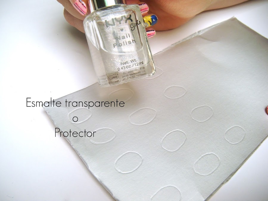5) Cuando esté listo y seco vamos a retirarlas con mucho cuidado (para retirarlas es que pusimos esmalte transparente afuera del círculo en el paso 3), sólo raspamos con nuestra uña un poquito por debajo para levantar una pestañita.