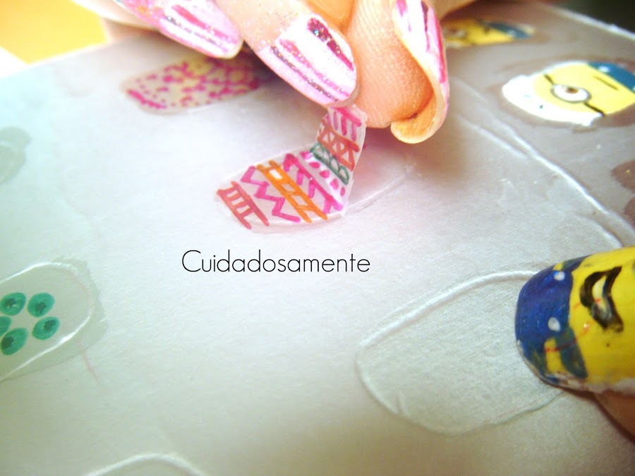 Atención: Para ponerla en la uña, de como la despegamos la vamos a voltear, es decir la cara en donde pintamos el diseño tiene que quedar viendo hacia la uña.