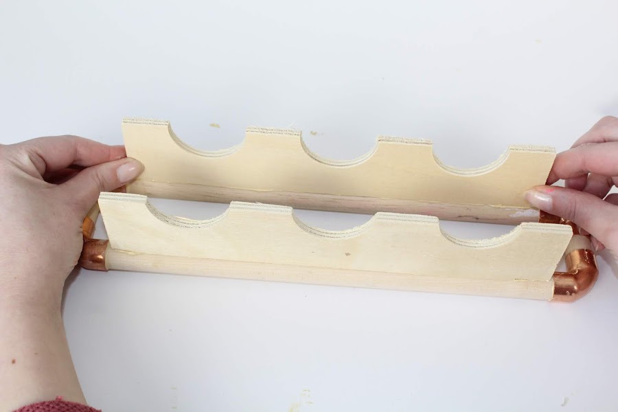 2 Paso: Pegaremos las madera en las partes más largas del rectángulo, las mías ya tienen la semiesfera porque son recicladas del interior de una caja de vinos, pero podéis usar el taladro para crear las hendiduras. Para crear más espacio de almacenaje, he pegado unas arandelas creando una pirámide.
