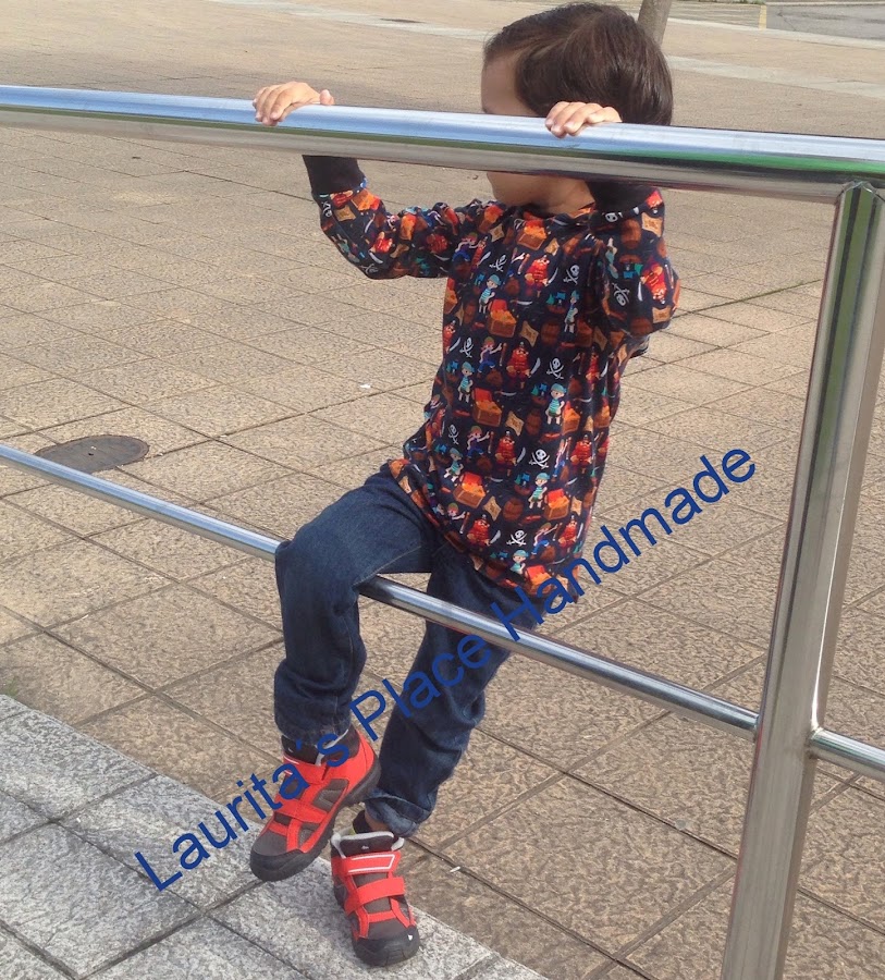 La tela la puedes encontrar aquí. Es de 210 gramos, por lo que no tiene el grosor de una sudadera pero tampoco es fino, lo cual es ideal porque a mi peque le agobian las sudaderas gruesas y los jerseys de lana ya ni te cuento, así que este grosor es ideal para poder ponerle una camisetita de manga larga debajo y que esté calentito, sin llegar a estar acalorado. ¡Ideal para parquear!
