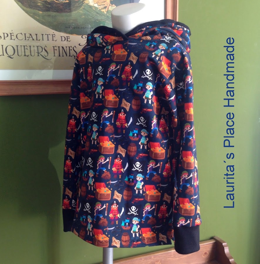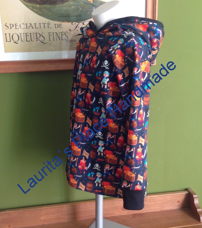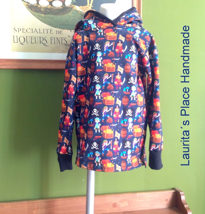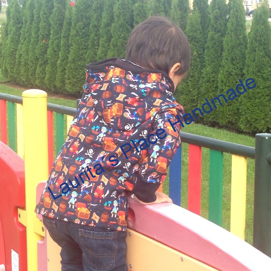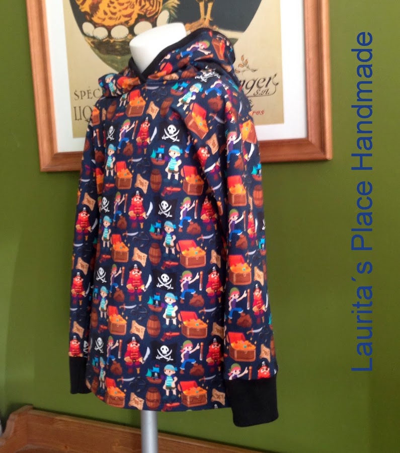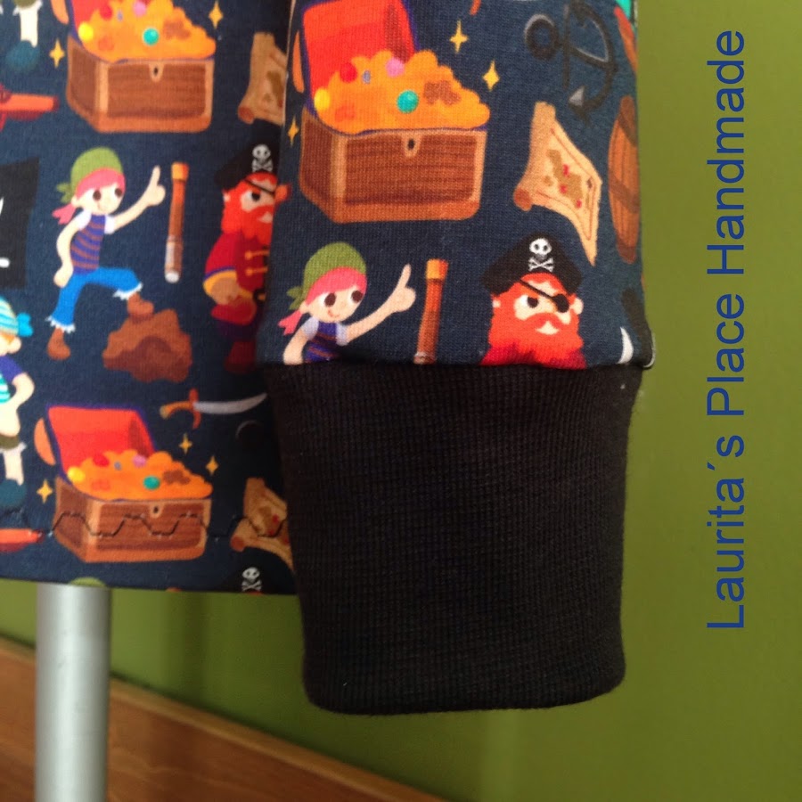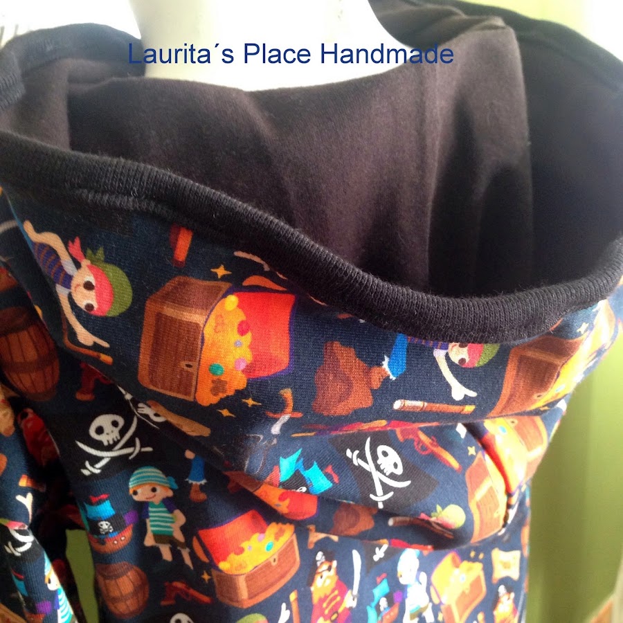 Creí que la capucha iba a ser un poco complicado pero para nada lo ha sido. En la parte interior de la capucha utilicé una tela de punto negra reciclada de un pantalón de deporte mío con el que no acababa de estar a gusto con él porque las perneras eran muy anchas, así que me viene que ni pintado para reciclarlo y aprovecharlo para esta capucha y para un pantalón para el pequeñín.