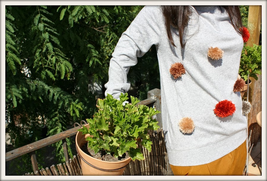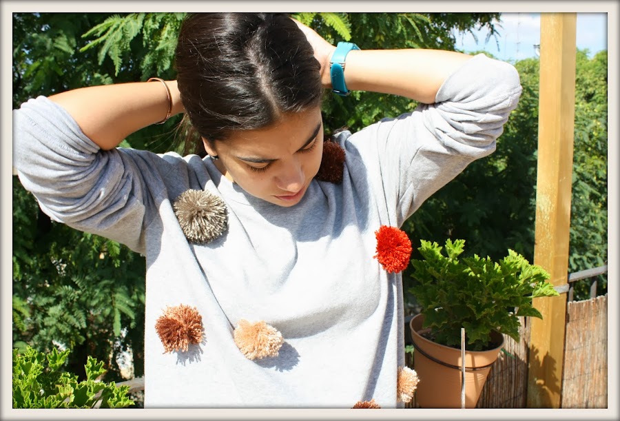Problemas aparte, os presento mi nueva creación, una sudadera a la que le he añadido pompones.