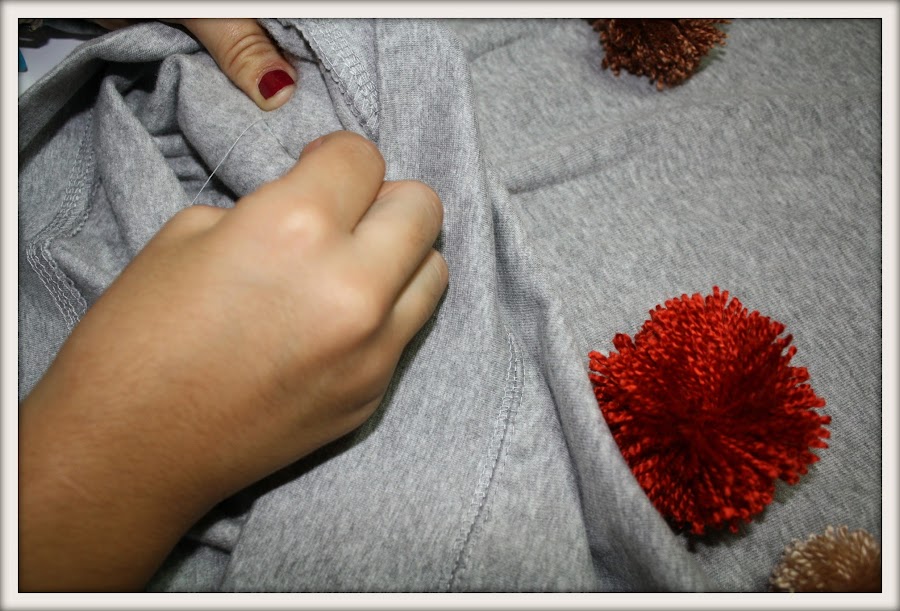Una vez que hemos "fabricado" los pompones nos ponemos manos a la obra con la sudadera: