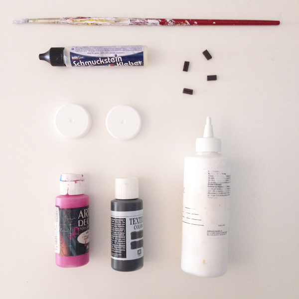 Además de eso vamos a necesitar imanes (yo he reutilizado los que vienen detrás de la lista de la compra para poner en la nevera), un poco de pegamento, pincel y la pintura del color que queramos.