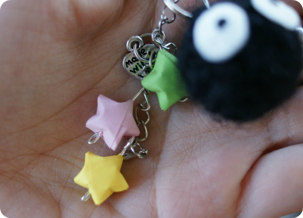 La verdad que es tan pequeñito que fue muy rápido de hacer, y encima me parece monísimo el resultado :) Y es que claro, así tan chiquitito... se parece aún más a los de "verdad"! Con las estrellitas quería imitar los caramelitos que comen los Susuwatari en la película. La pena fue que yo creía que tenia abalorios con forma de estrellita para poder decorar el resto del colgante, pero parece ser que no, así que al final hice unas estrellitas 3D de papel que, aunque son menos resistentes, cumplen bien su función y le dan un toque muy bonito.