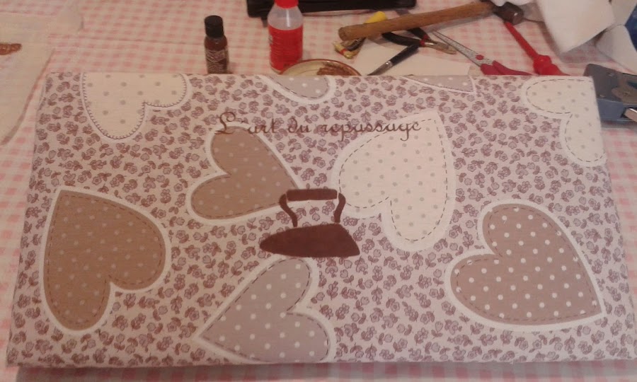 Se necesita, un tablero de la medida que mas os convenga, el mio es de 25x50cm., guata, tela bonita para la parte superior, tela menos bonita para cubrir los remates de abajo del tapizado, pegamentos para tela, grapadora de tapizar, patitas (si queréis), plantilla, pintura para tela, y pasamanería.