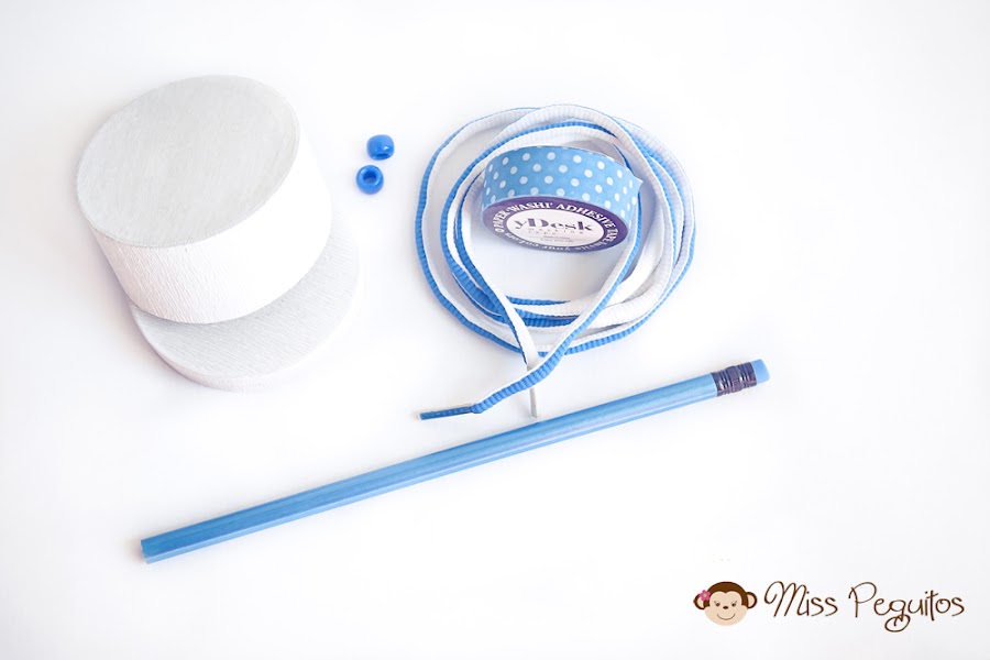 Los materiales son muy sencillos y fáciles de encontrar, caja de cartón redonda, podéis utilizar las de los quesitos, lápiz, cuentas, cordón de zapatos o cuerda gruesa y whasi tape.