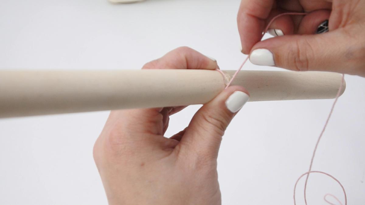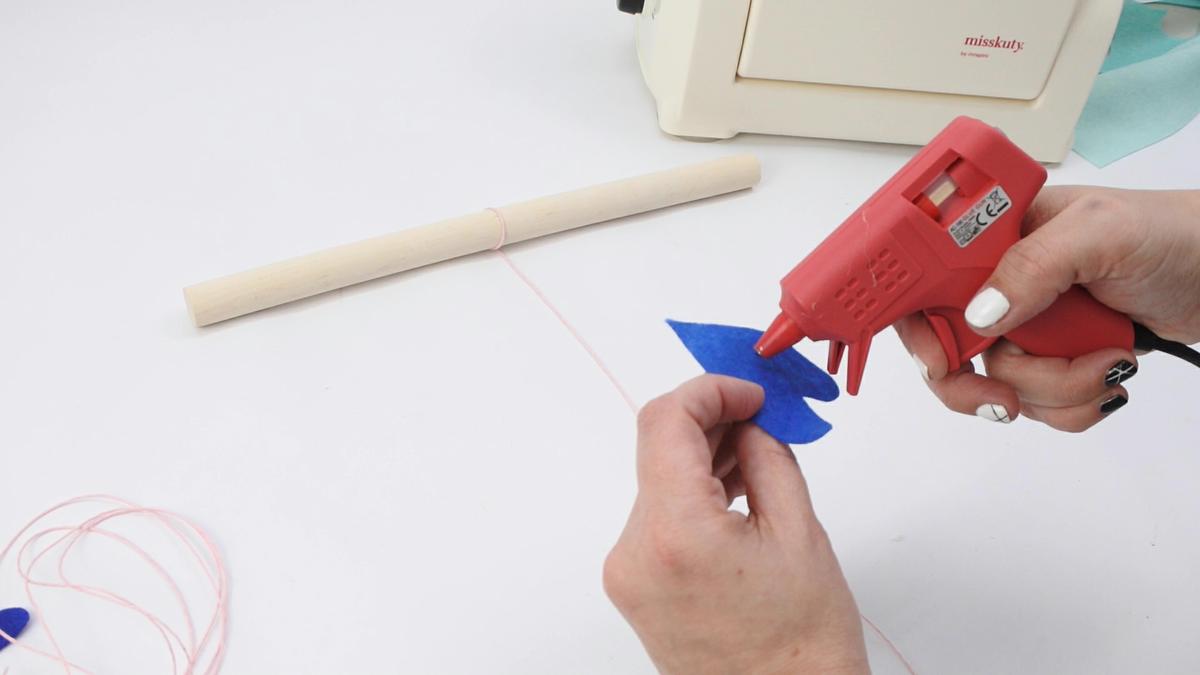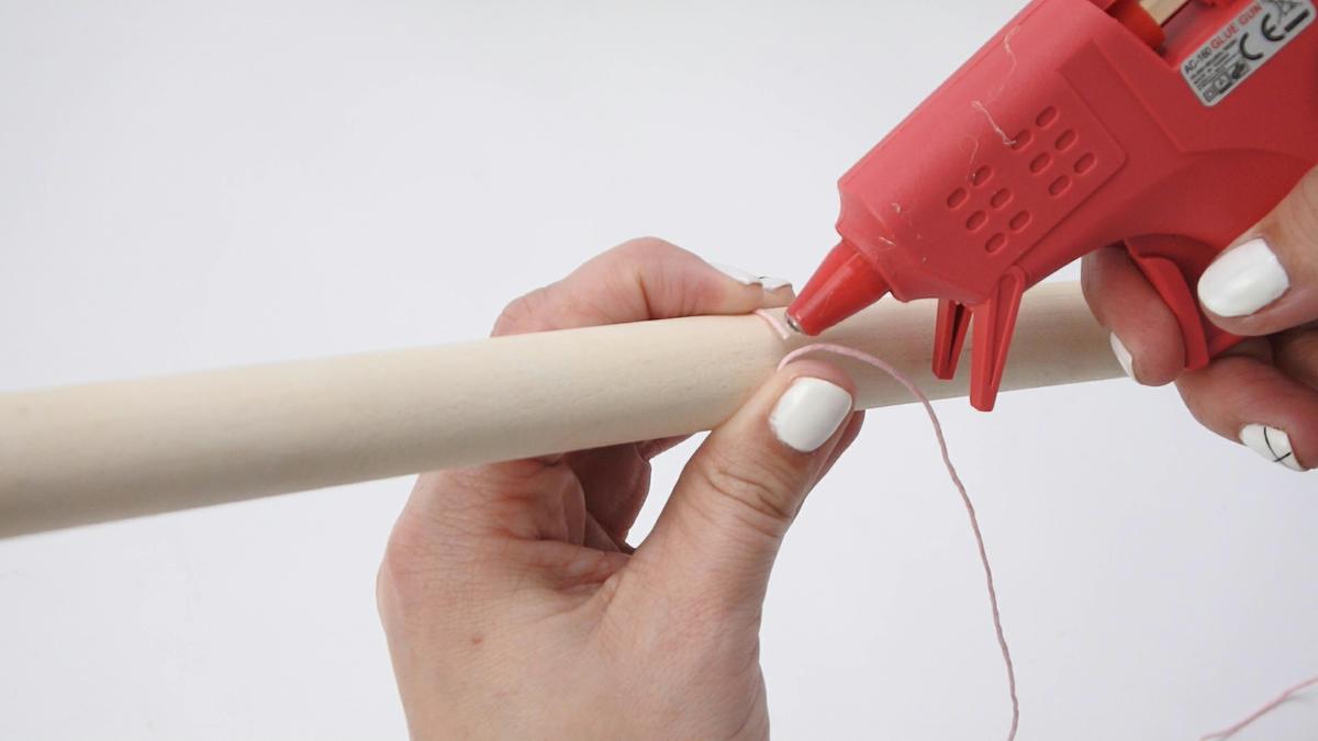 Una vez los tenemos cortados, con la ayuda de la pistola de silicona caliente los pegamos a nuestra barra de madera que será el soporte de nuestro tapiz.