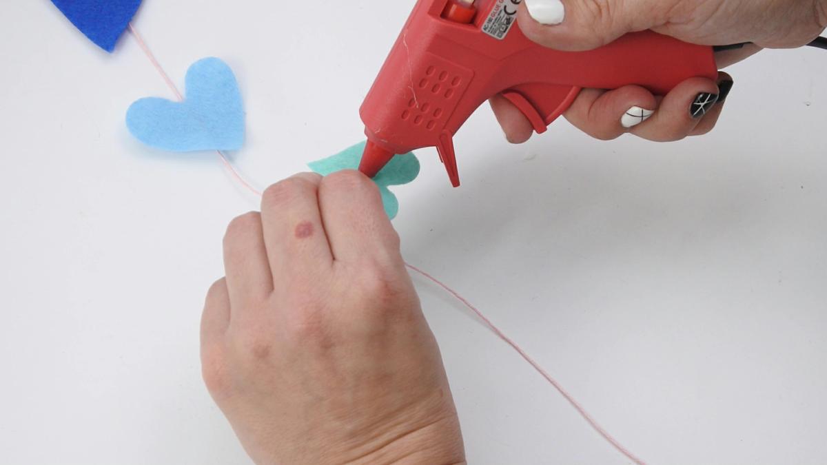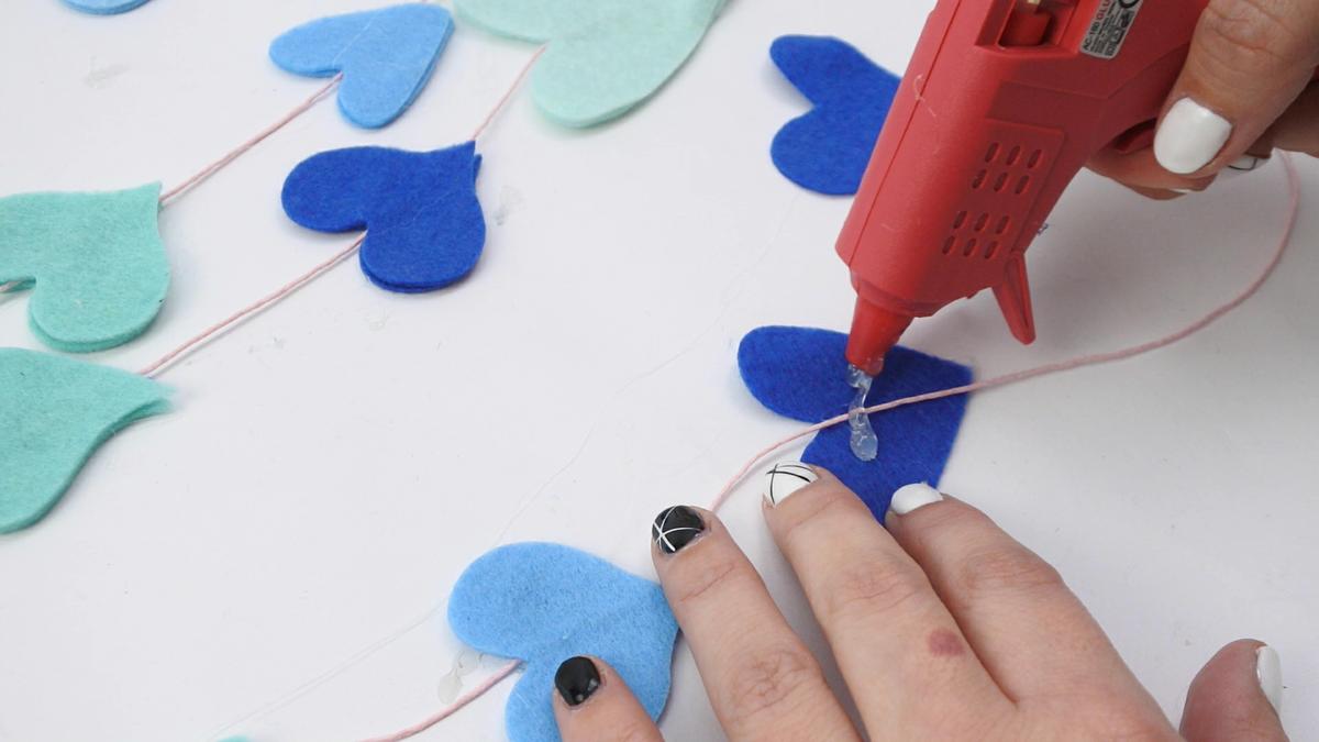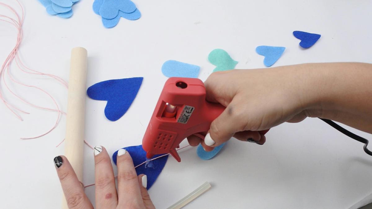 Una vez tenemos todos los corazones que necesitamos cortados, es el momento de darle forma a nuestro tapiz. Para ello nos vamos a ayudar de la pistola de silicona.