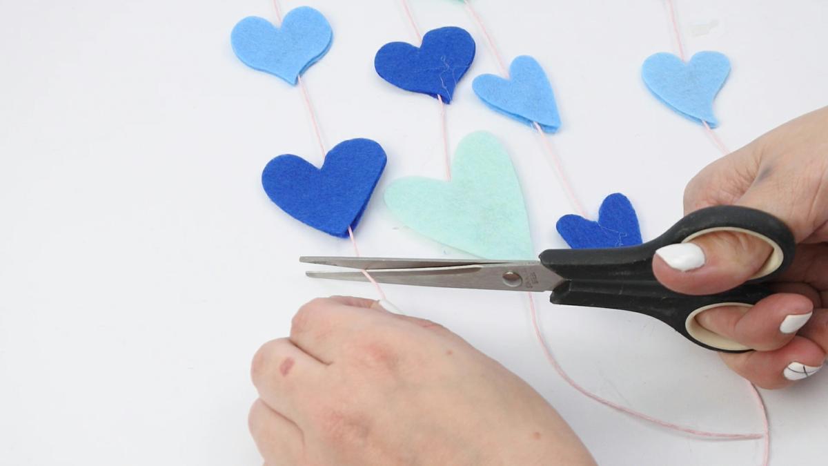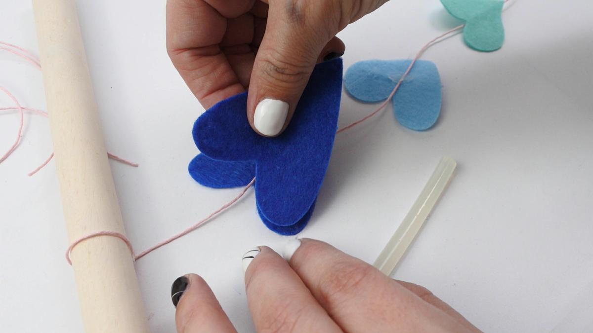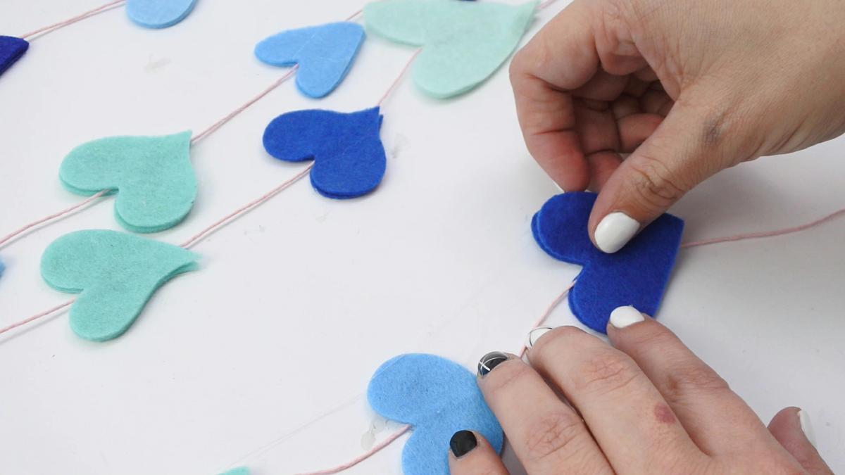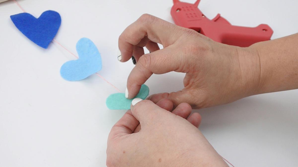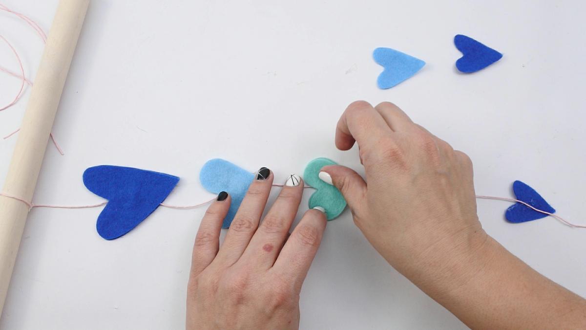 Con los hilos colocados, vamos colocando los corazones. En nuestro caso hemos ido alternando los diferentes colores y formas de estos.