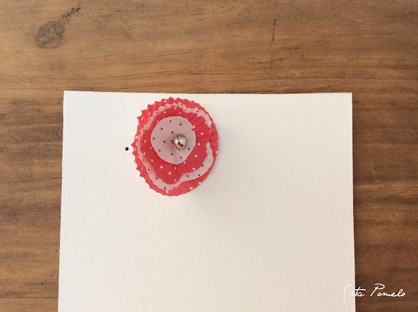 Con la ayuda de un pin de papelería, he enganchado la flor al cartón por su parte lisa.