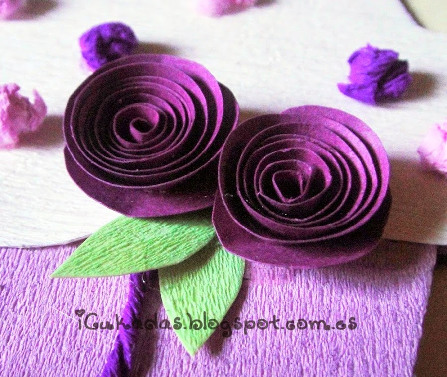 11. Y para terminar, le ponemos unas flores hechas de cartulina para adornar, yo he puesto unas rosas en espiral pero se pueden poner unas margaritas, un botón o un lazo, cualquier aplique que os guste.