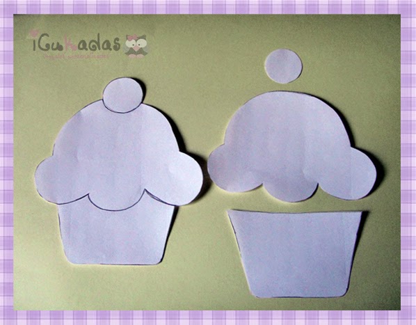 Y hacemos lo mismo con las plantillas de las partes del cupcakes, pero esta vez sin poner la cartulina doble. La base y la guinda en cartulina morada, y el frosting en cartulina blanca.
