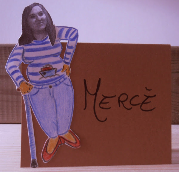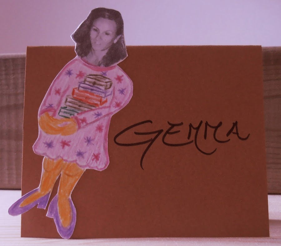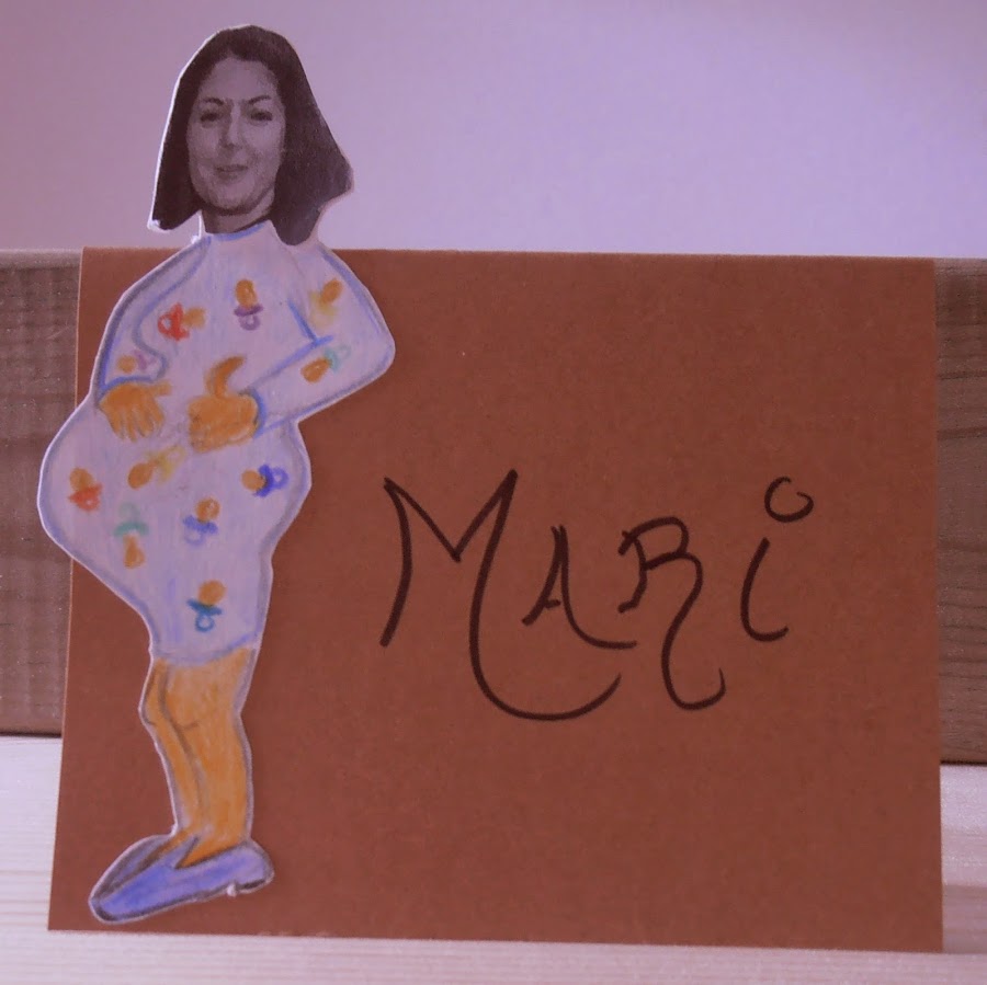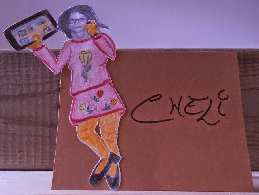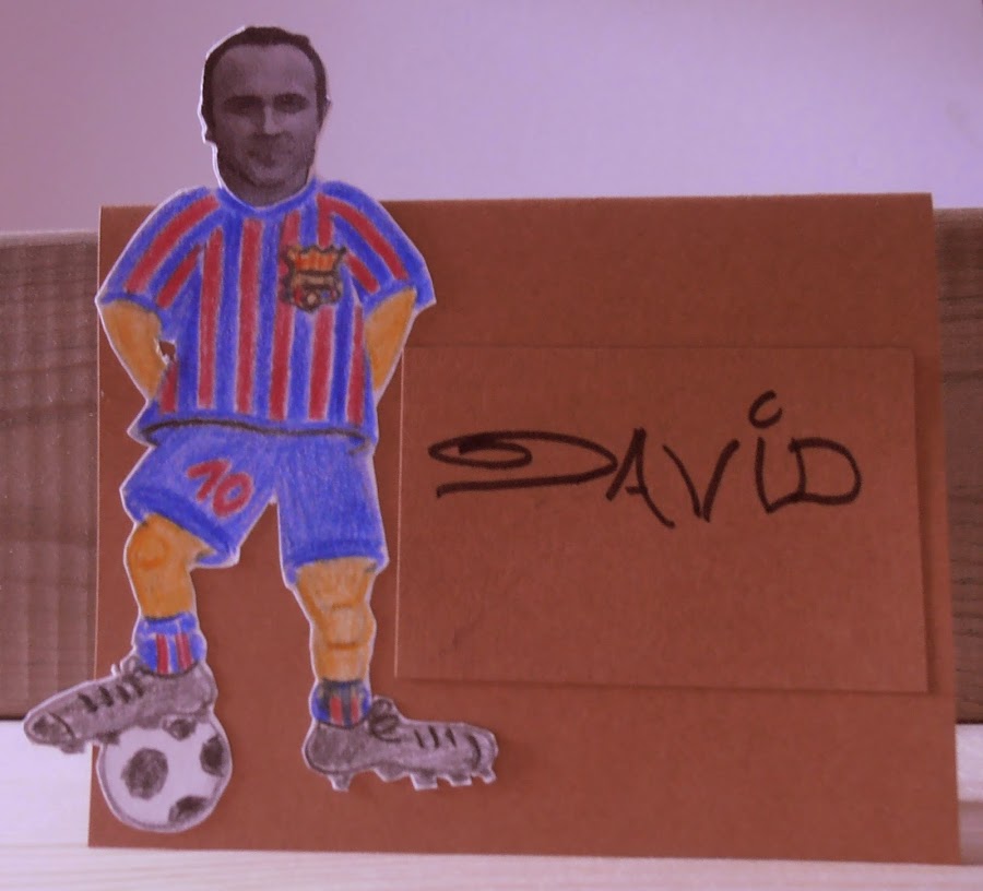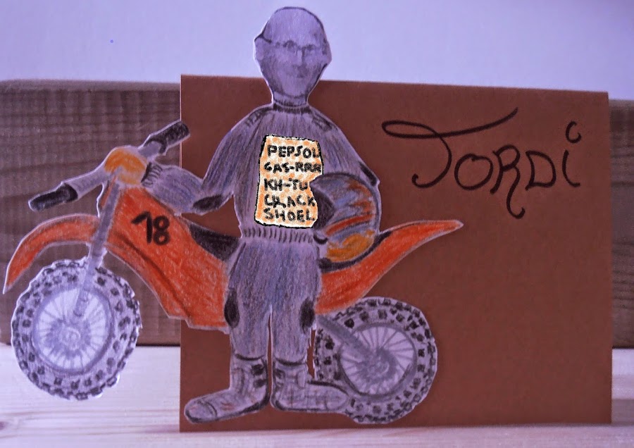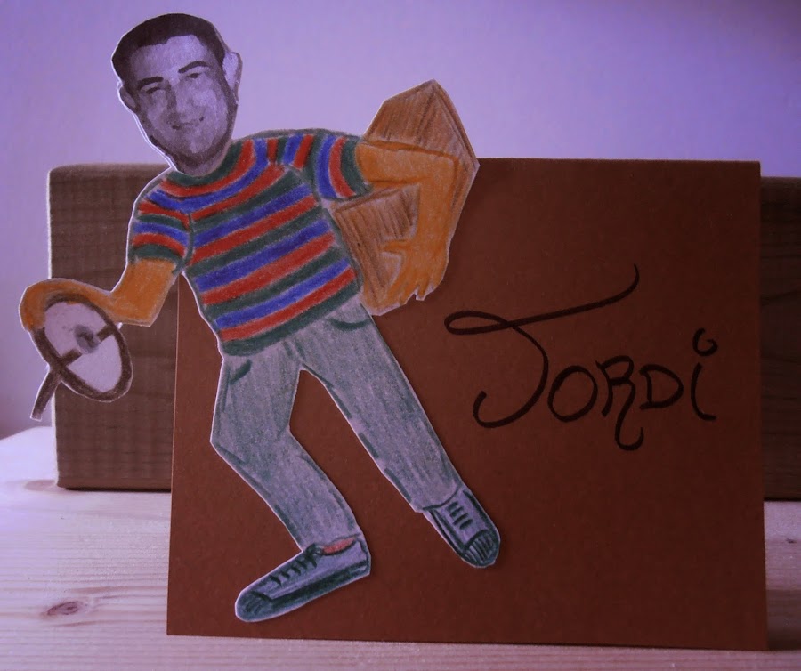 · Pinté el cuerpo con lápices de colores. Recorté toda la silueta, y lo enganché en una cartulina ya cortada en forma de tarjeta y puse el nombre de cada uno.