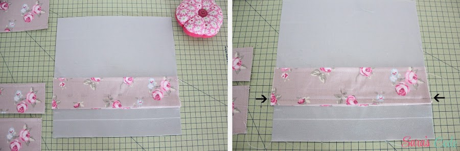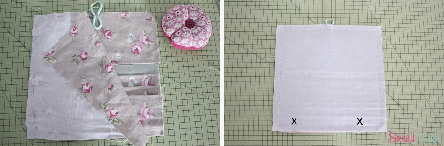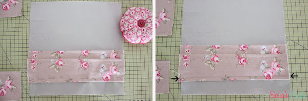 ? Alineamos el lado sin doblar del tercer bolsillo pequeño con el borde inferior y sujetamos con alfileres.