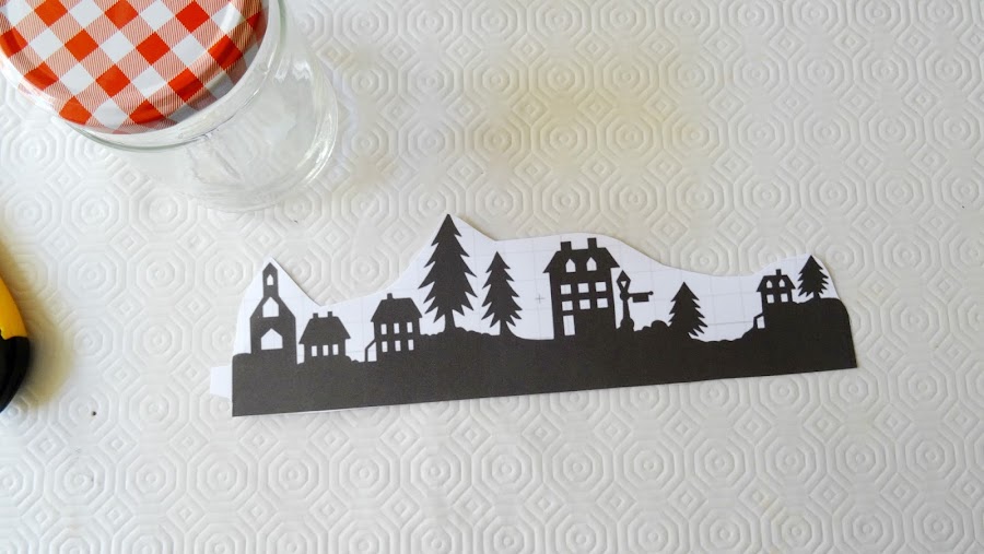 Una vez la nieva está seca, enganchamos por fuera la silueta del pueblo, para ello utilizamos la pestaña que dejamos al recortar.