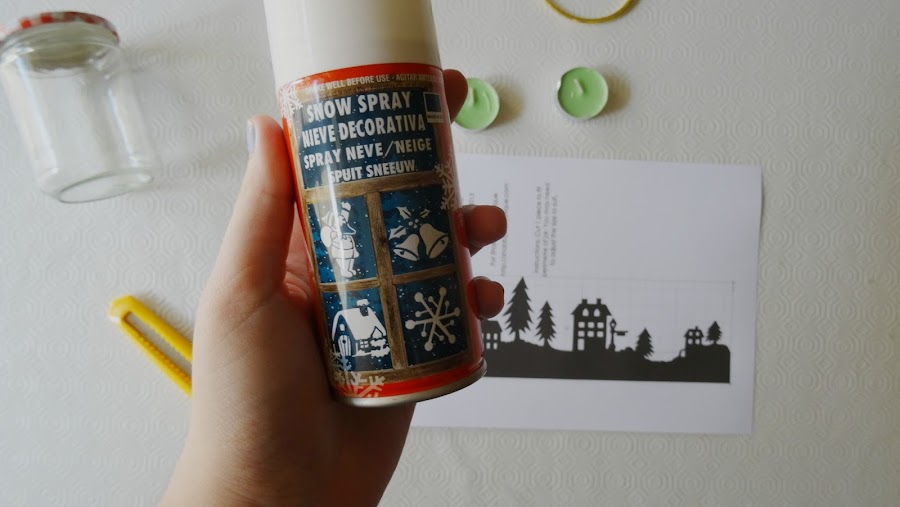 Ahora le ponemos un poco de nieve en spray por toda la parte de afuera, sin pasarnos mucho. También podemos poner por dentro bolitas de estas que simulan la nieve para darle otro toque.
