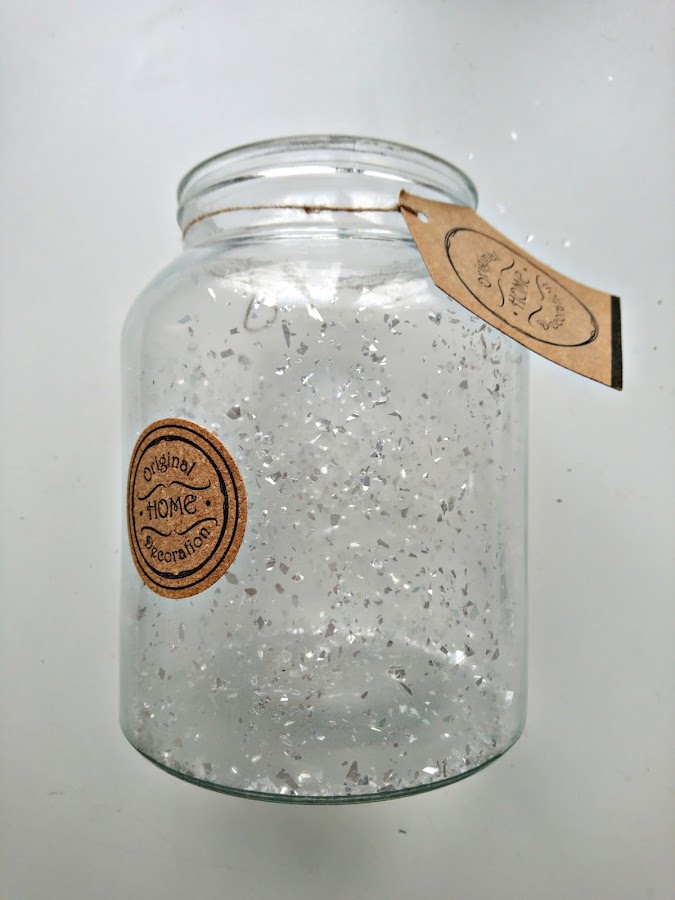 Empezamos decorando el bote para que de la sensación que está nevando, para ello echaremos por la parte interior pegamento en spray, y espolvoreamos el confeti a nuestro gusto, para mi gusto, no coloquéis demasiado porque no se apreciará la decoración interior.