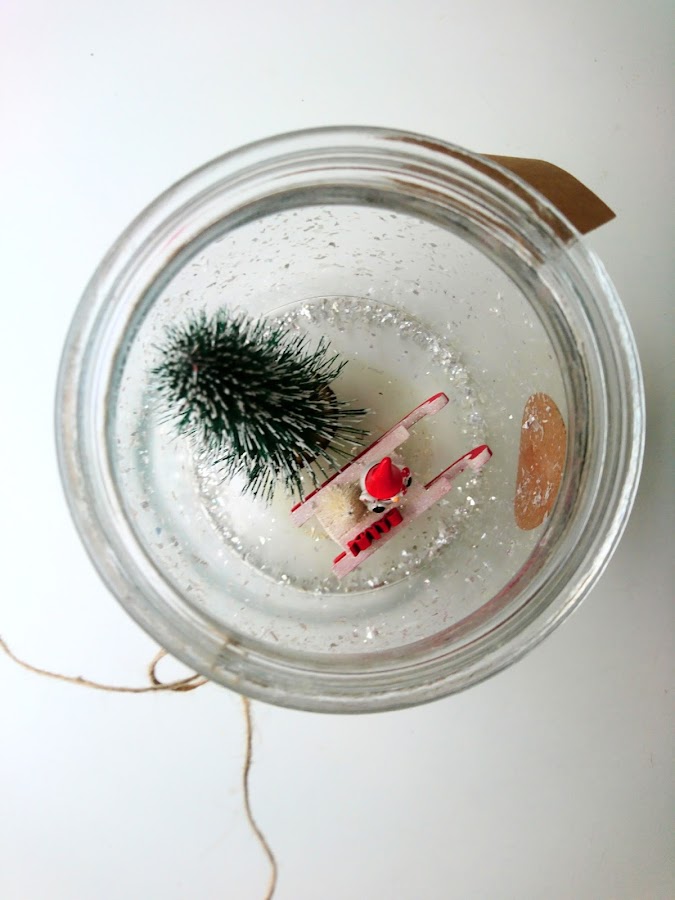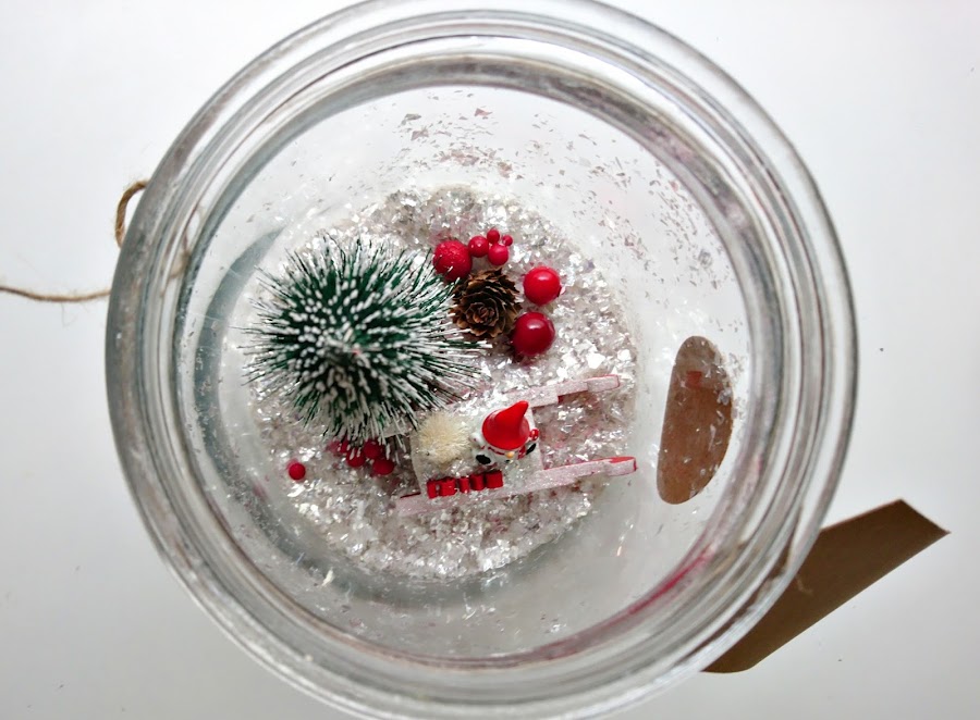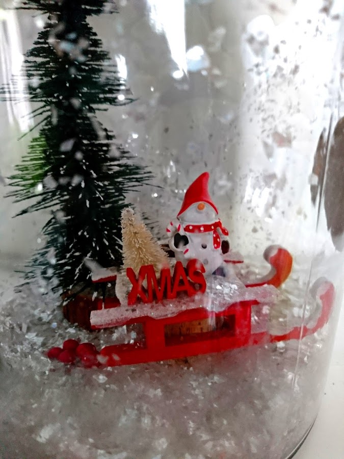 Una vez pasado el tiempo de espera, vamos a echar el resto del confeti para que cubra el fondo del tarro y así parezca que la nieve que cae se va depositando. También coloqué una piña y unas bolitas rojas.