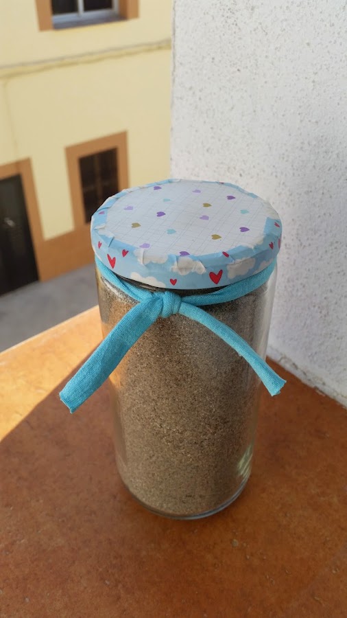 Para que no quede tan sosillo, un trocito de trapillo anudado al cuello del tarro, en mi caso he elegido el color azul simbolizando el mar.