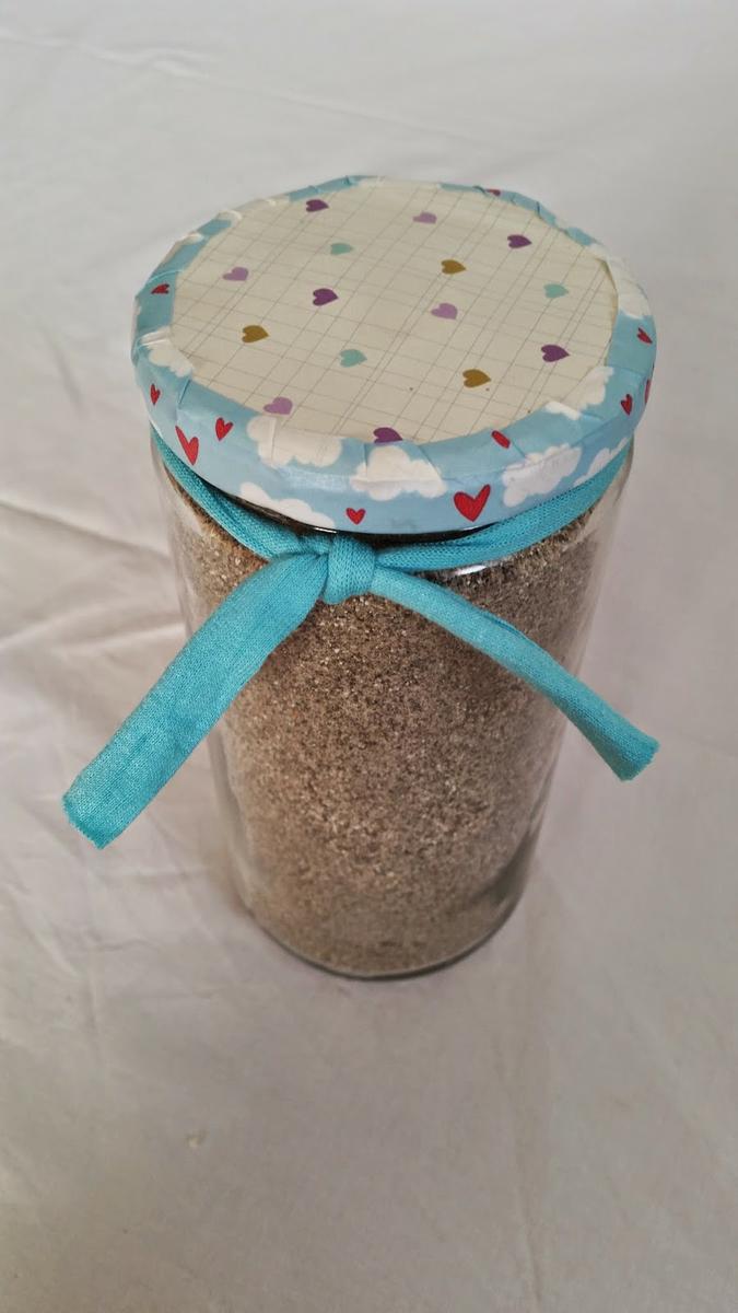 Para que no quede tan sosillo, un trocito de trapillo anudado al cuello del tarro, en mi caso he elegido el color azul simbolizando el mar.