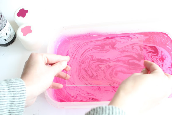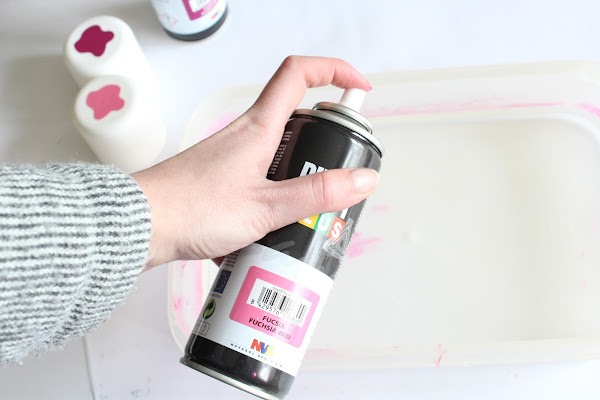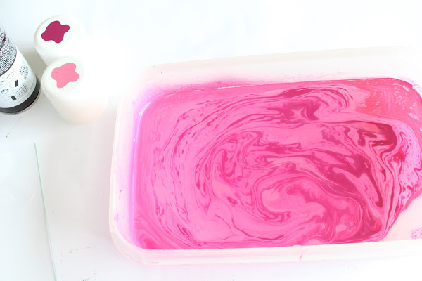 Segundo Paso: Preparamos el recipiente con agua y añadiremos los colores (Yo he escogido el Fucsia 4003 y el Purpura B127 de la linea Basic de Novasol Spray). Primero el claro, luego el oscuro y así hasta tener el fondo que queremos.