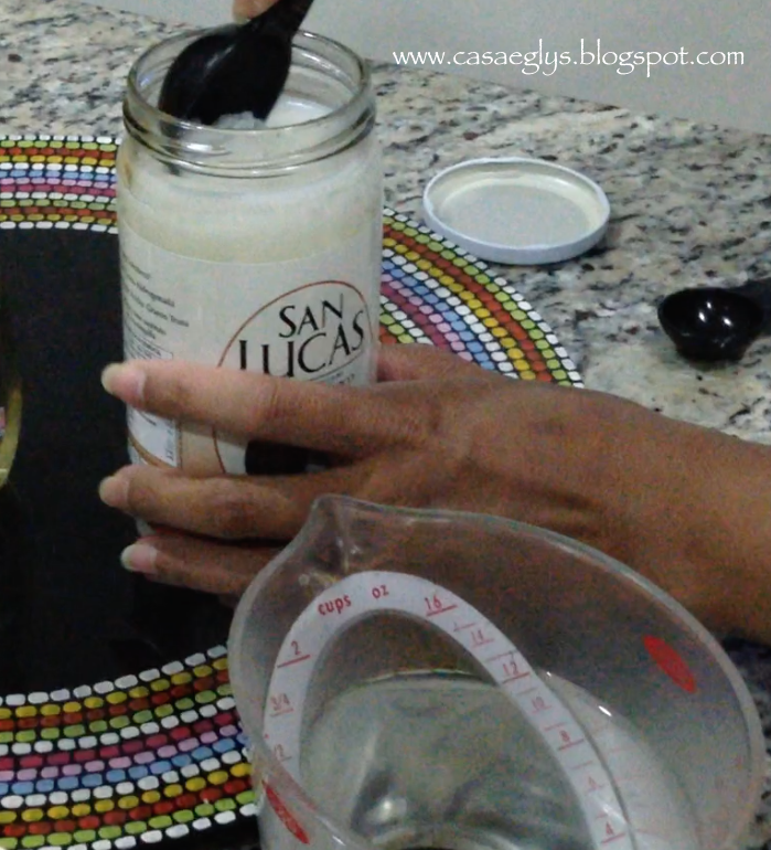 En una taza medidora realiza la siguiente mezcla: una taza y media de agua caliente, 1una cucharada de aceite de coco, media cucharada de champo de bebe y media cucharada de aceite de bebe. Revuelve bien para que se disuelva todo.