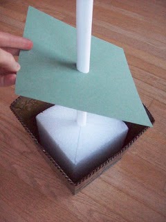 Paso a paso:1. Colocamos el cubo en el recipiente, y clavamos el palito previamente pintado de blanco.