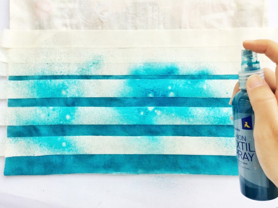 En el último tramo ponemos más cinta para que no se nos manche sin querer la tote bag. A continuación empezamos a pulverizar el producto sobre la tela. Yo quería un efecto continuo así que apretaba el tapón hasta abajo, pero si lo aprietas sólo hasta la mitad consigues unas gotas como de salpicadura que también quedan genial.