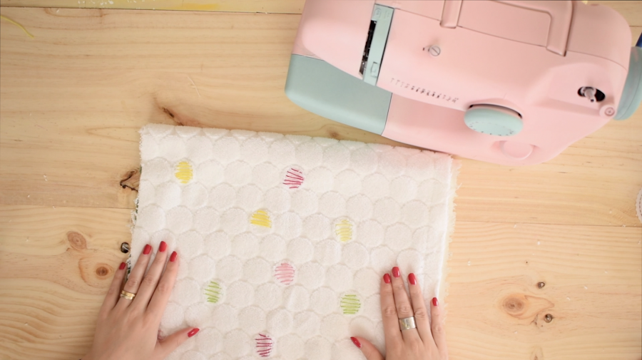 2 Paso: Coseremos uno de los laterales de la toalla al forro de tela, dejando el otro libre.