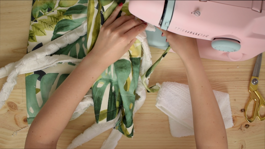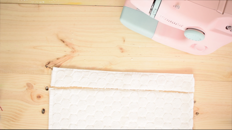 1 Paso: Cortaremos los laterales de la toalla para hacer las asas, una vez cortados coseremos las tiras.