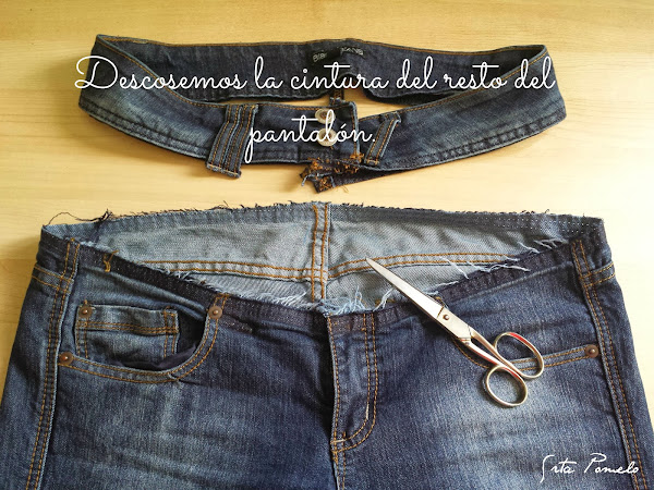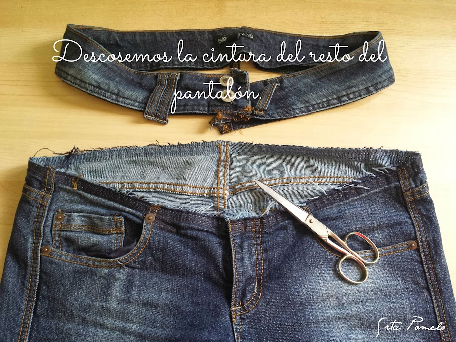 Vamos a comenzar descosiendo la cintura del vaquero, poco a poco con la punta de la tijera o con uno de esos cacharritos para despuntar (que no sé cómo se llaman). La cintura la reservamos si el día de mañana queremos que el pantalón vuelva a ser como antes.