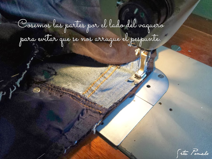TRUCO: cosemos por la parte del vaquero para que la tela elastica no se nos arrugue conforme vayamos avanzando con el pespunte, que será recto y de longitud media.